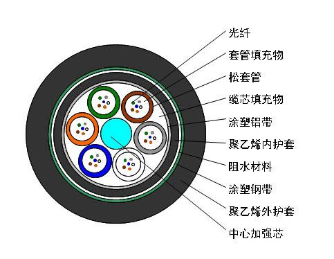 GYTA53光纜的結(jié)構(gòu)是將250µm光纖套入高模量材料制成的松套管中,松套管內(nèi)填充防水化合物。纜芯的中心是一根金屬加強(qiáng)芯,對(duì)于某些芯數(shù)的光纜來(lái)說(shuō),金屬加強(qiáng)芯外還需擠上一層聚乙烯(PE)。松套管(和填充繩)圍繞中心加強(qiáng)芯絞合成緊湊和圓形的纜芯,纜芯內(nèi)的縫隙充以阻水填充物。涂塑鋁帶(APL)縱包后擠一層聚乙烯內(nèi)護(hù)套,雙面涂塑鋼帶(PSP)縱包后擠制聚乙烯護(hù)套成纜。
